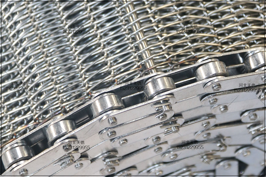 鋼絲編織鏈條輸送帶:長(zhǎng)度50米,輸送面積寬度460mm,鏈條節(jié)距38.1mm,串桿直徑8mm,串桿間距:3節(jié)一根,絲直徑:1.2mm,鋼絲編織螺距8mm,鋼絲編織節(jié)距15mm,擋邊高度3公分,擋邊厚度1.2mm,全部材質(zhì)不銹鋼304材質(zhì),耐高溫耐酸堿耐腐蝕。
