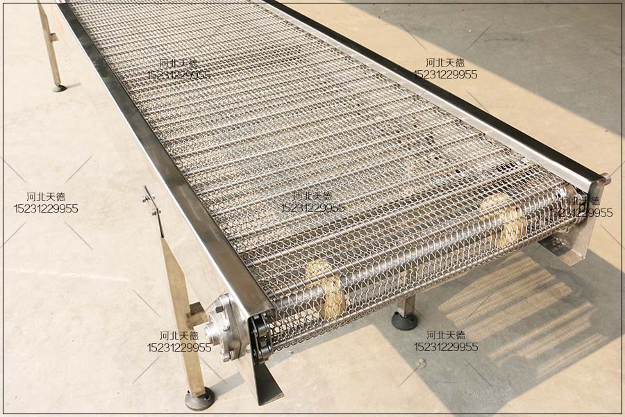 遼寧的客戶來電咨詢不銹鋼304材質網帶輸送機,客戶是要兩套同樣的規格的輸送網帶輸送機,一條不銹鋼輸送帶要求是用來清洗蔬菜,還有一條是用在烘干機上烘干蔬菜,采用的是鏈條式不銹鋼輸送帶。 兩條輸送網帶的總寬度是一樣的,都是560毫米的總寬度,其中的一套需要我們廠家做好不銹鋼輸送機把網帶安裝在輸送機上,另外一套是只定制鏈條輸送帶,客戶需要自己更換烘干機上的輸送帶。我們一般說的總寬度指的是輸送帶的滿外寬, 如果是更換不銹鋼網帶的情況,準確的方法是測量鏈輪的中間距離,這樣測量是偏差比較小的一種測量方式,天德公司的輸送機機架采用的是鋼板折彎機架,材質可以是不銹鋼材質也可以是碳鋼烤漆的,高度是300mm折彎是60mm再向里面折30mm的一個邊.客戶定制的輸送機長度是6米,輸送網帶的長度就是12米,輸送網帶的網孔做的比較大是15*25mm的,絲徑用的是2.0mm的絲徑??蛻舻氖卟饲逑礄C是把我們的輸送機定制回去然后自己加裝噴淋裝置,不銹鋼網帶上還要加裝高4公分厚1mm的擋邊來防止有些體積小的蔬菜從鏈條網帶上掉下去。