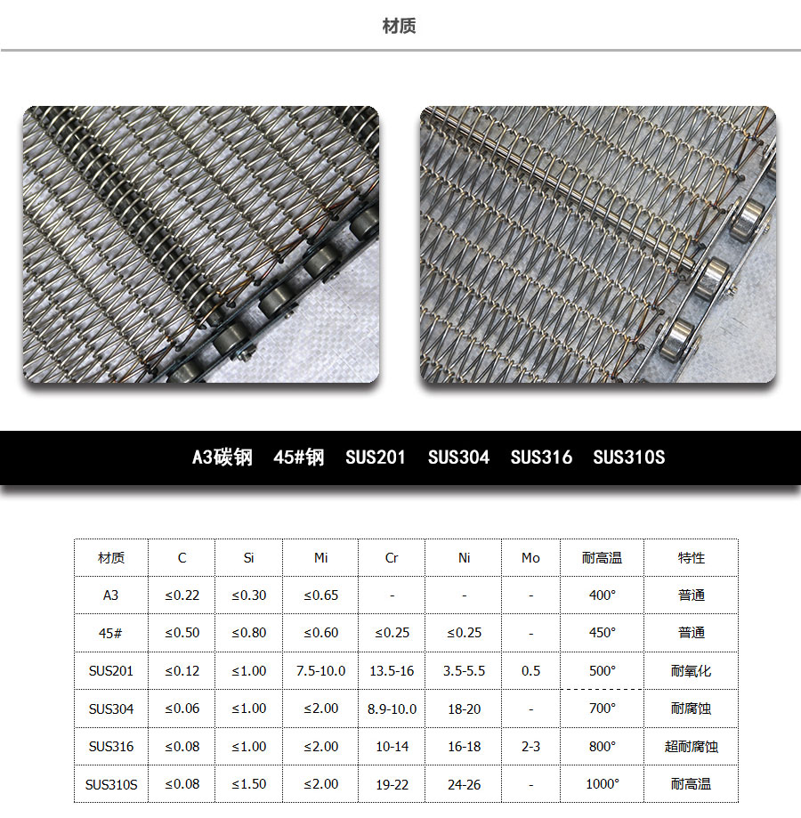 這種鏈桿式網帶采用鏈條傳動,適用于大型和重型傳送,其運動平穩、力量大,網面相對受力小,能對輸送網面起到保護作用,成本較貴,但使用壽命長。大開孔或者小開孔網條;溫度范圍零下55攝氏度到1150攝氏度;邊緣擋板和橫向擋板。