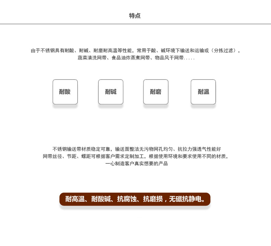 不銹鋼網(wǎng)帶屬于非標(biāo)準(zhǔn)件,我們將根據(jù)你提供的規(guī)格長(zhǎng)寬,材質(zhì),不銹鋼絲線徑,編制結(jié)構(gòu)尺寸,支軸直徑,支軸間距,鏈條型號(hào)等數(shù)據(jù)制作.