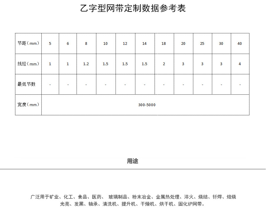 乙字型網(wǎng)帶簡(jiǎn)介:乙字型網(wǎng)帶又稱乙型網(wǎng)帶、食品網(wǎng)帶、巧克力網(wǎng)帶,節(jié)距分隔一般按用戶要求定制,屬非標(biāo)準(zhǔn)輸送網(wǎng)帶。
