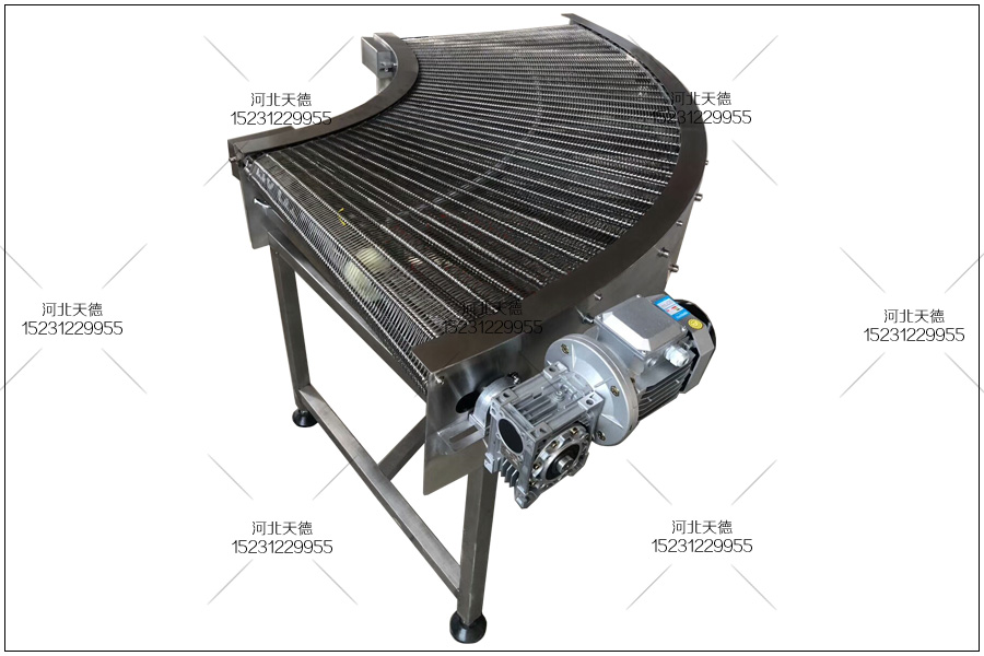 江西撫州客戶定制的轉彎網帶輸送機,用來加工輸送餅干,將生產好的餅干輸送到下一個工序進行包裝,這種輸送機采用鏈條式轉彎輸送帶,輸送帶內徑鏈條節距為31.75毫米,外徑輸送鏈條的節距為50.8毫米,轉彎網帶輸送機采用不銹鋼304耐高溫耐腐蝕材質板材進行加工,能在水里或者高溫情況下長期使用。