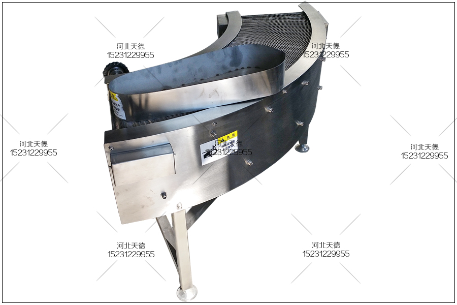 輸送形式為鏈條式金屬網(wǎng)帶,結(jié)構(gòu)形式為轉(zhuǎn)彎形式,轉(zhuǎn)彎角度為100度左右,機(jī)身采用2.5不銹鋼折彎加工,輸送機(jī)腿能夠進(jìn)行上下30公分的調(diào)節(jié),輸送機(jī)寬度400毫米,鏈條金屬網(wǎng)帶寬度為350毫米,采用1.2毫米的不銹鋼絲壓彎串接而成的,使用的是U型轉(zhuǎn)彎鏈條,采用6毫米的支桿鏈接。這種結(jié)構(gòu)形式的金屬網(wǎng)帶耐用性很高。是輸送行業(yè)與食品行業(yè)中不錯(cuò)的選擇。